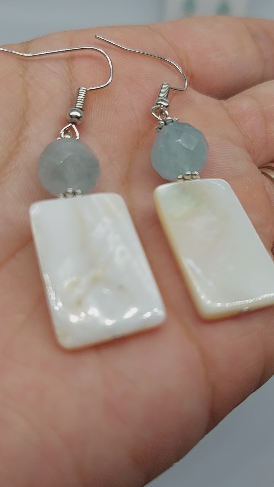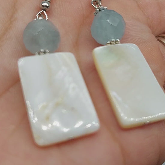 Mother of pearl shell and aquamarine beaded dangle earrings on stainless steel earring hooks.