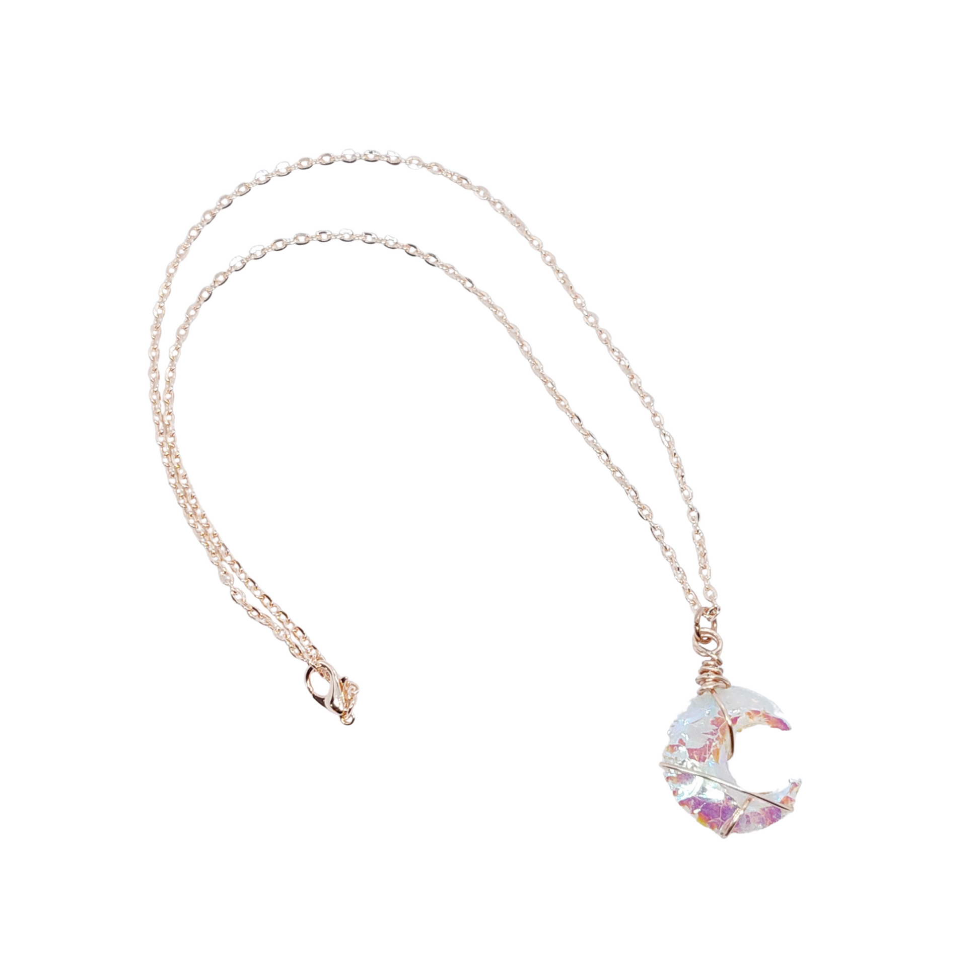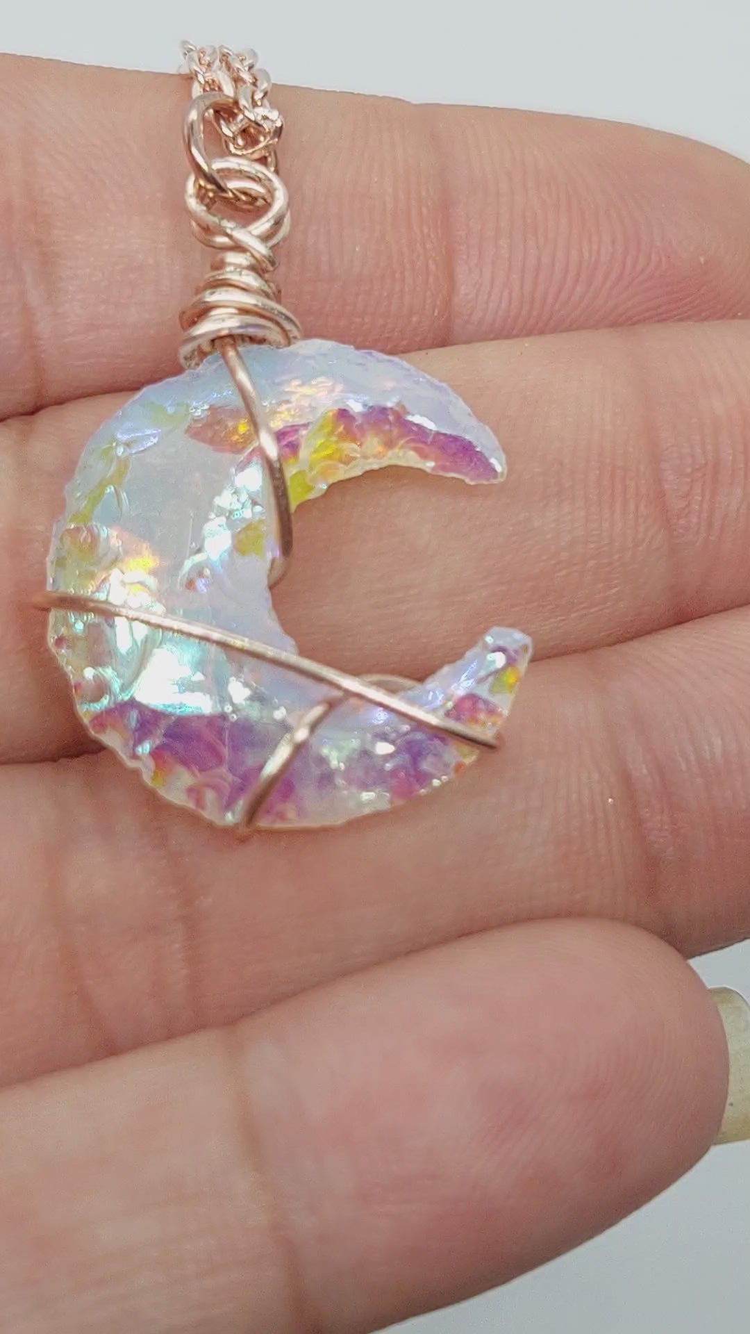 Angel aura quartz crescent moon wrapped in non tarnish rose gold wire on 18 inch rose gold plated stainless steel chain.