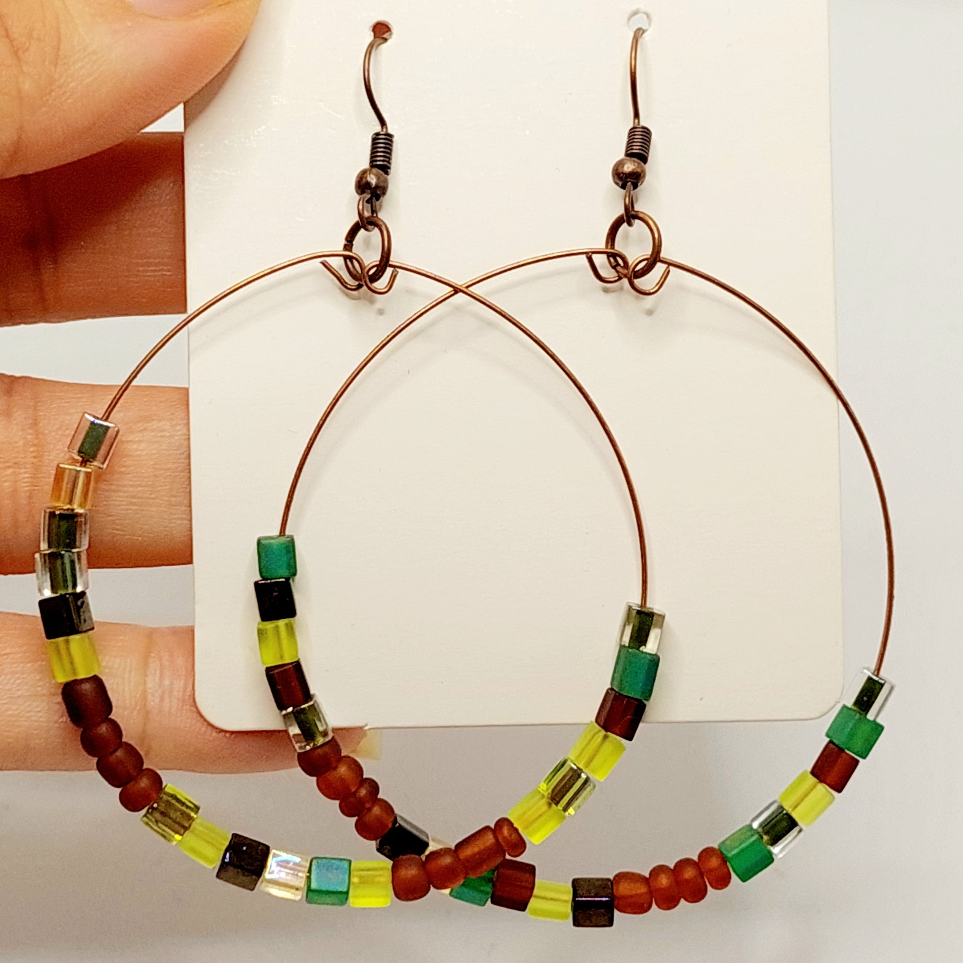 Multi colored glass beaded 2 inch hoops on bronze hypoallergenic earring hooks.