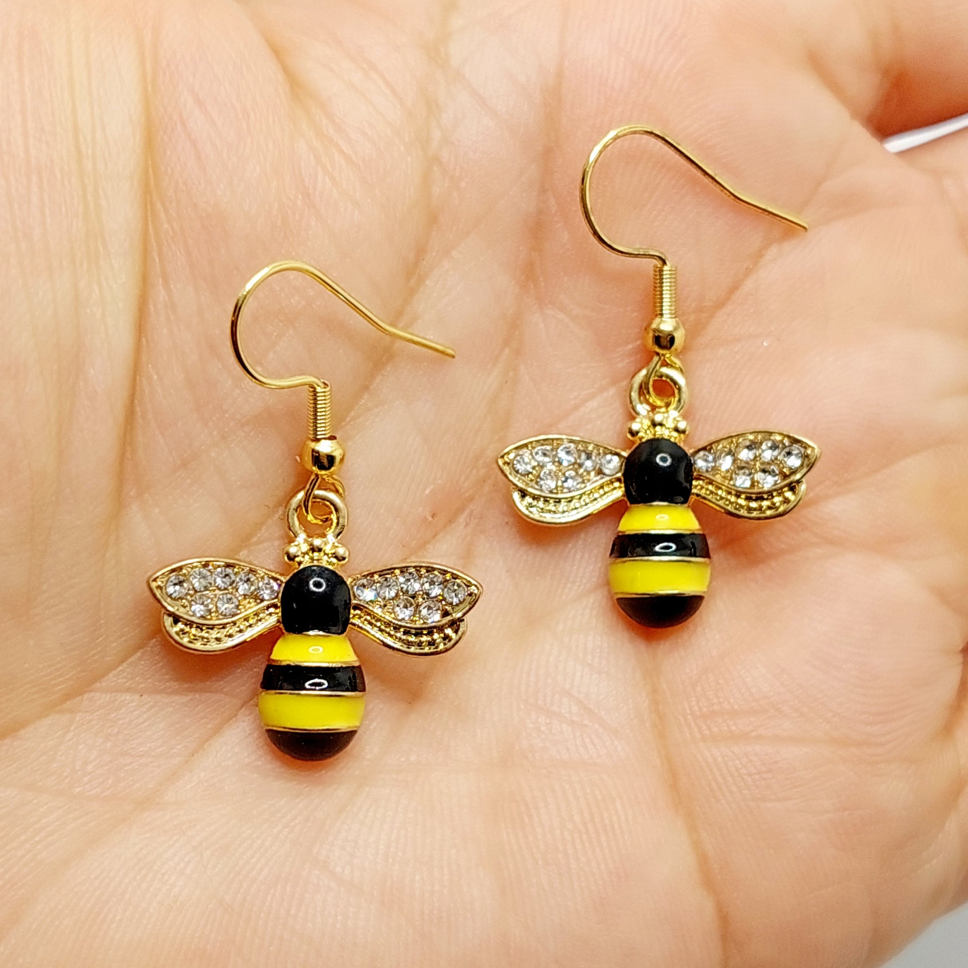 Enamel bee charms on gold plated stainless steel earring hooks.