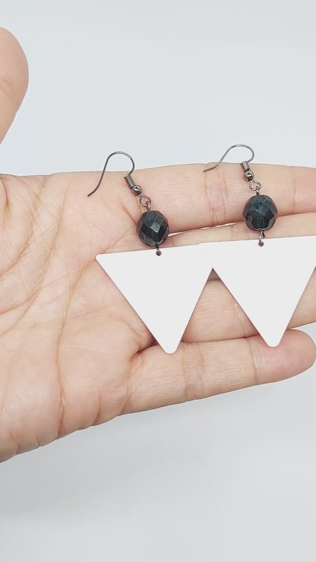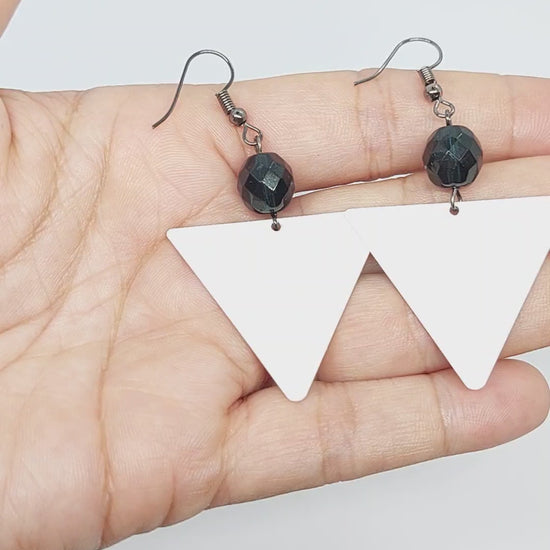 White metal triangles with deep blue glass bead on hypoallergenic earring hooks.