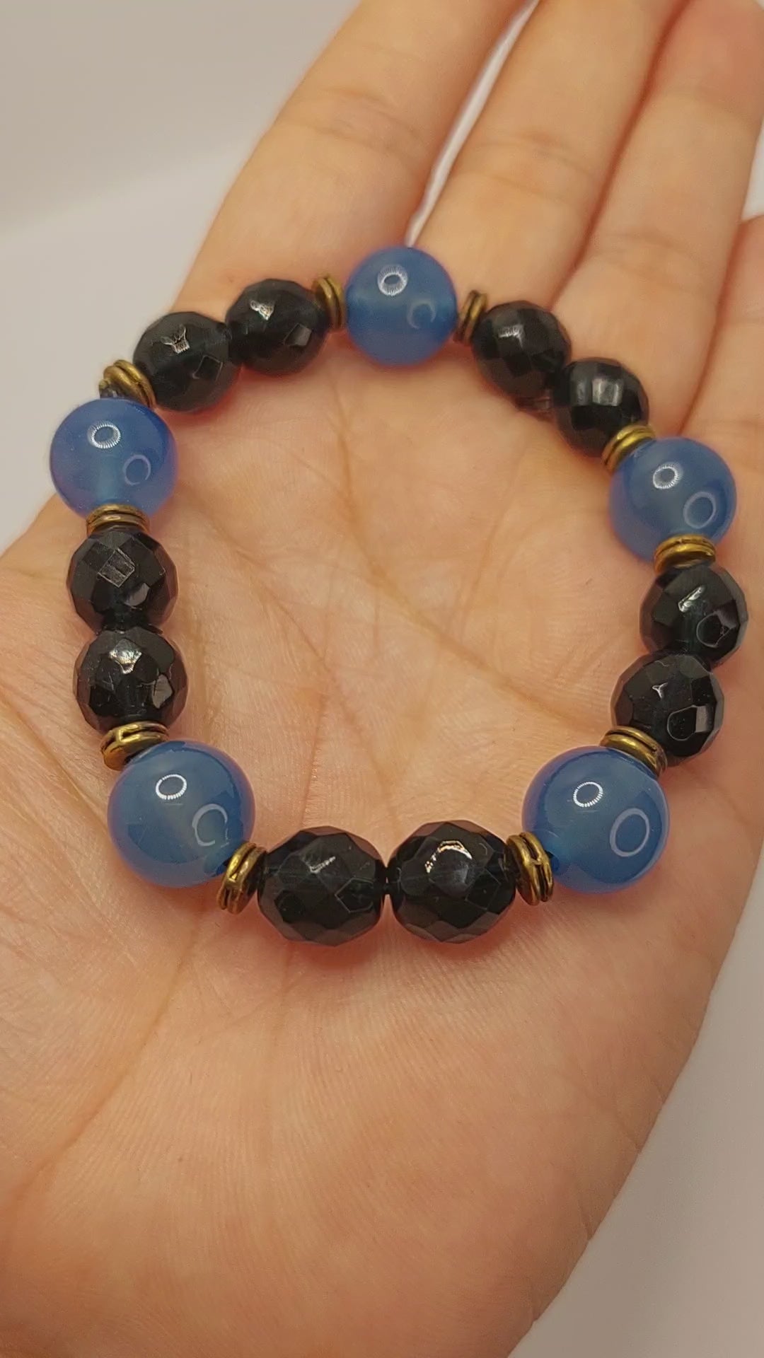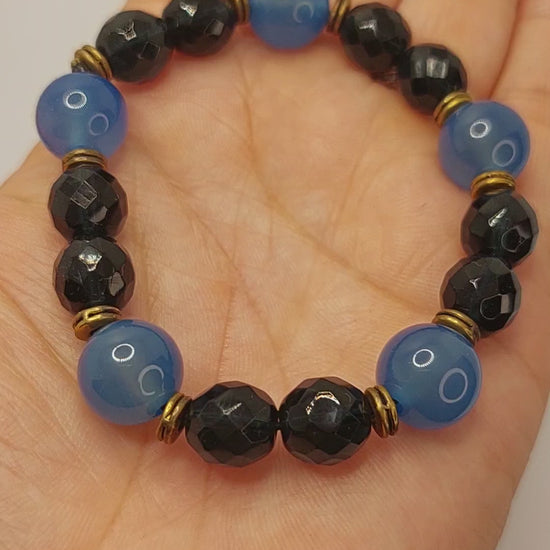 Blue jade and dark blue faceted glass Beaded elastic stretch bracelet with gold accents.