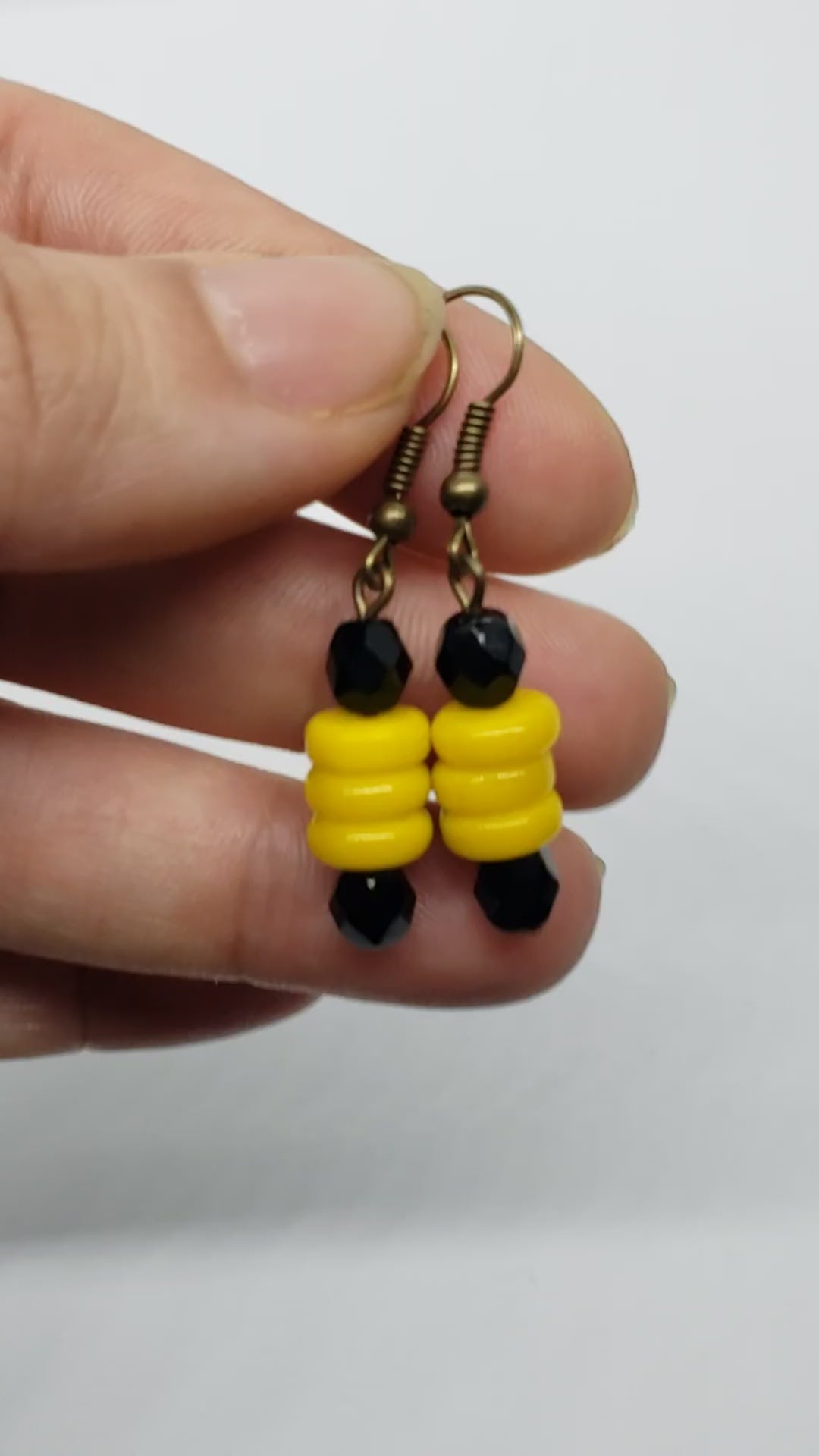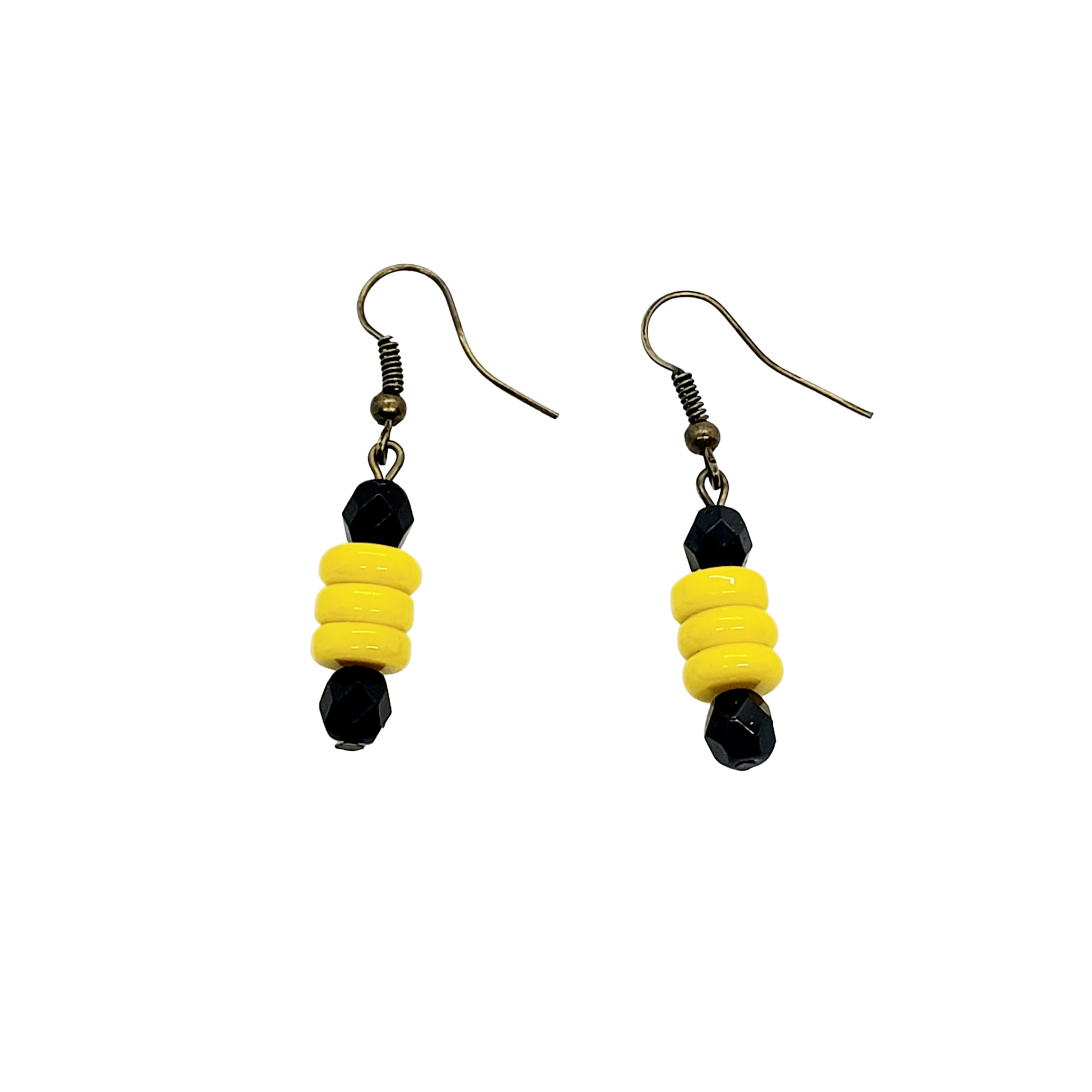 Black and yellow glass beaded dangle earrings with stainless steel hypoallergenic earring hooks.