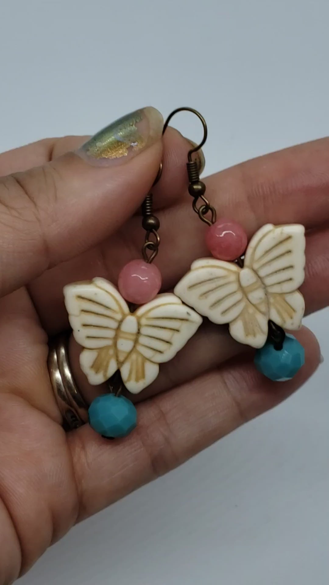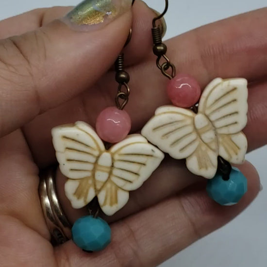 Butterfly magnesite bead charm with faceted pink and blue beads on bronze tone stainless steel hypoallergenic earring hooks.