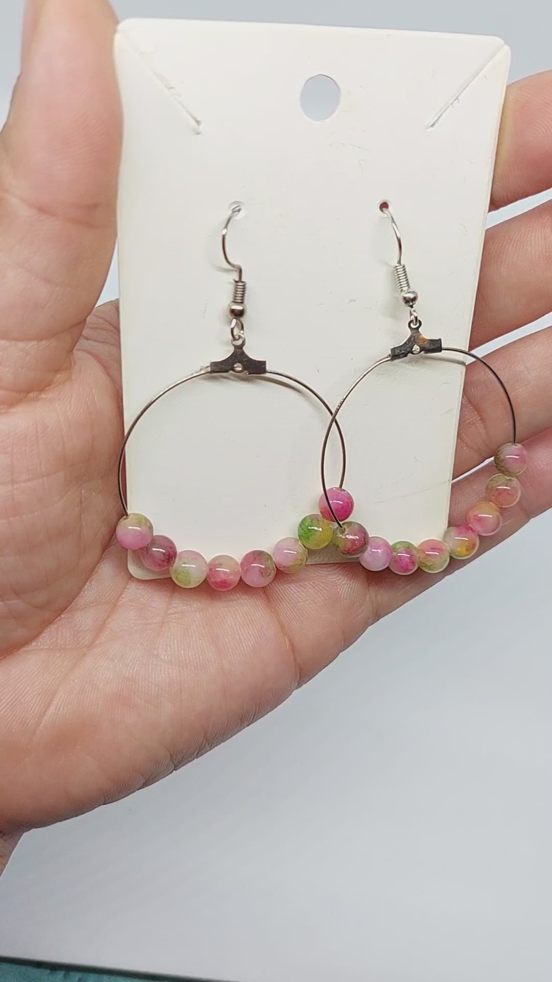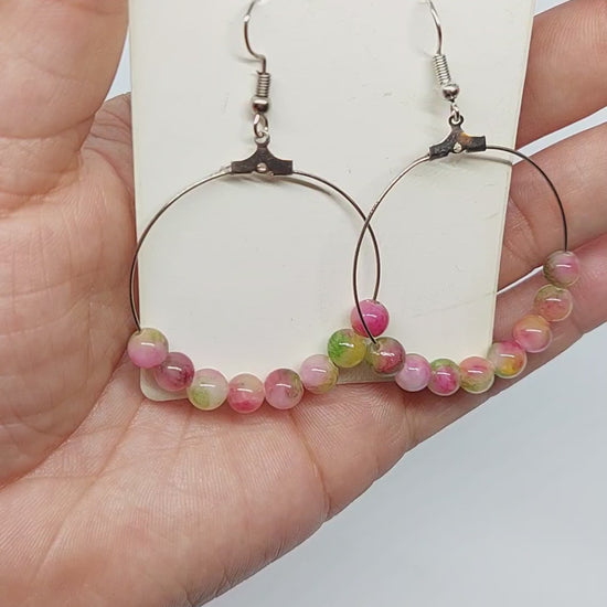 Dyed green and pink jade beads on stainless steel earring hoop.