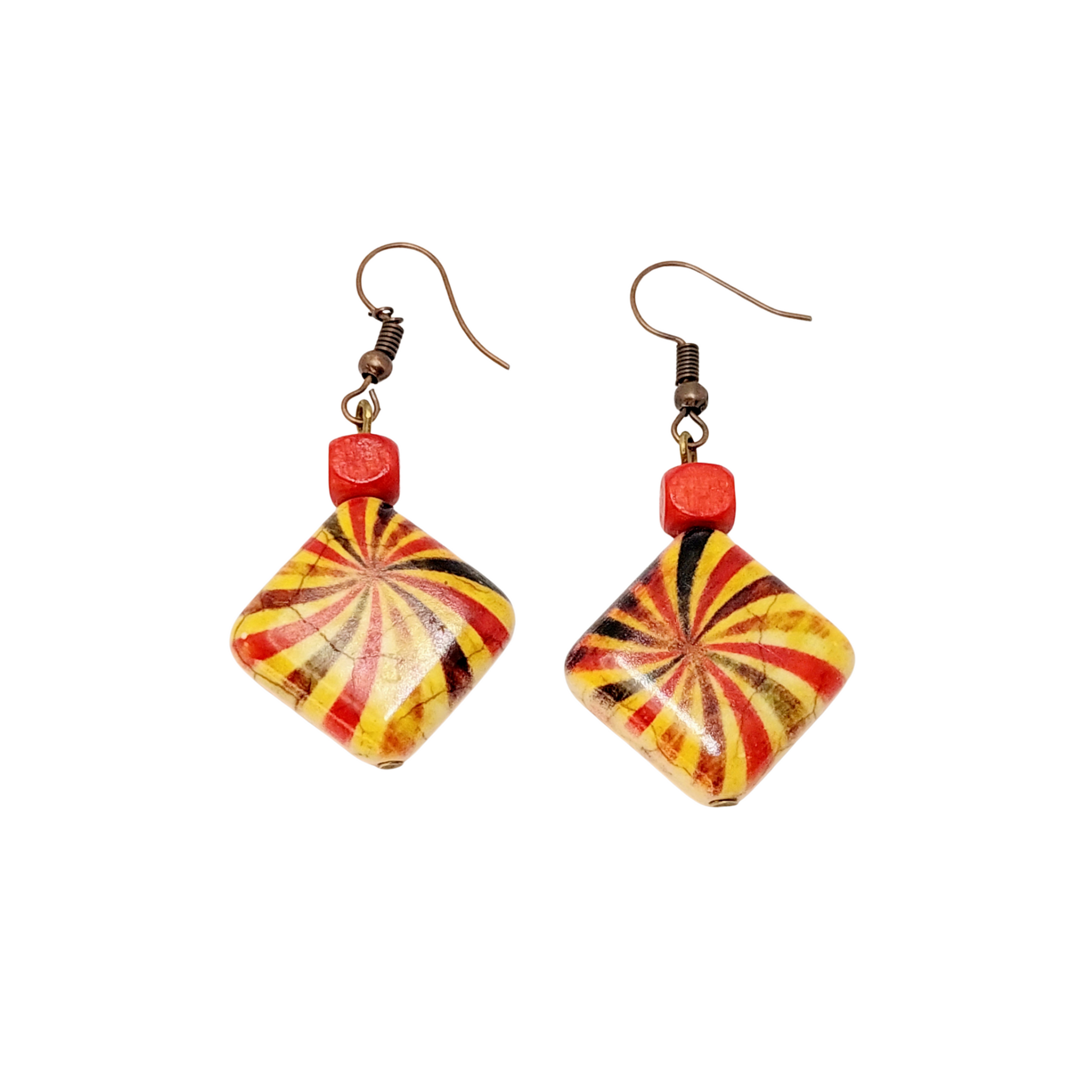 Candy stripe beads with red wooden beads on stainless steel earring hooks.
