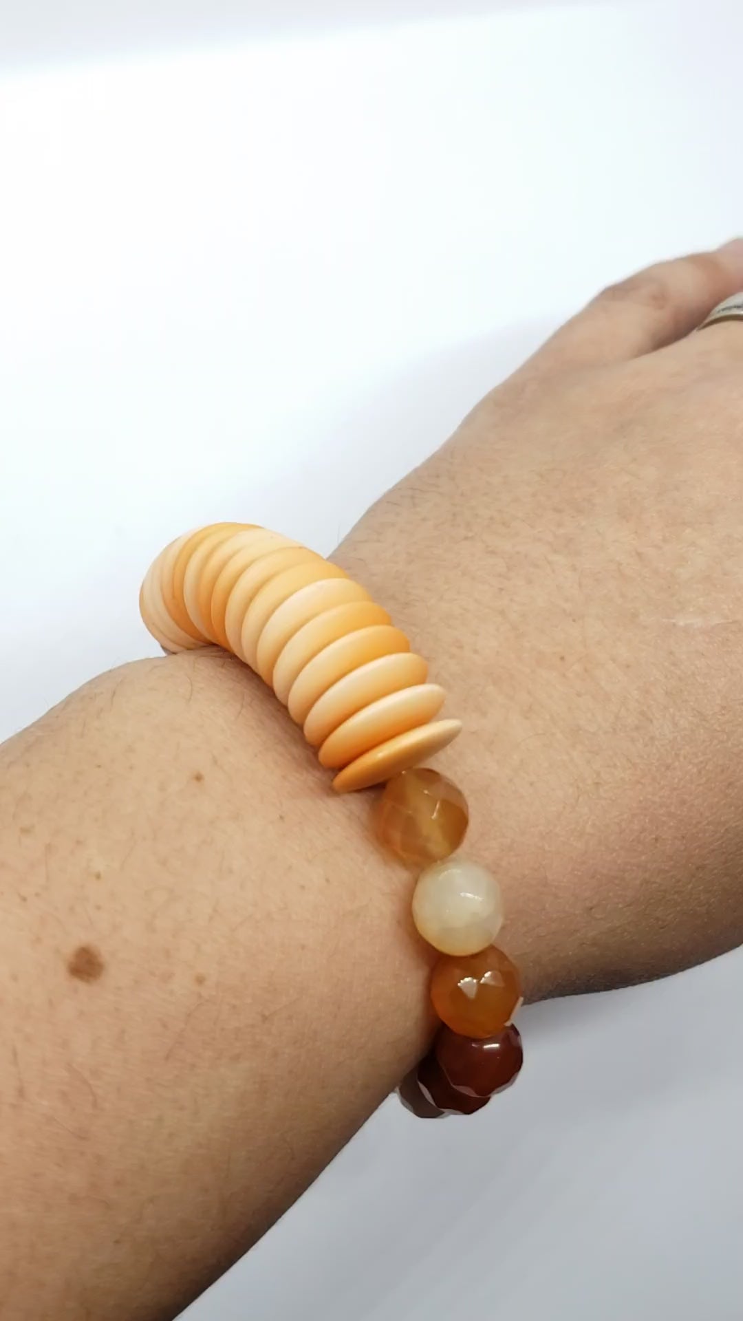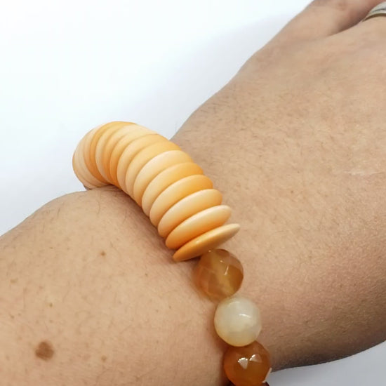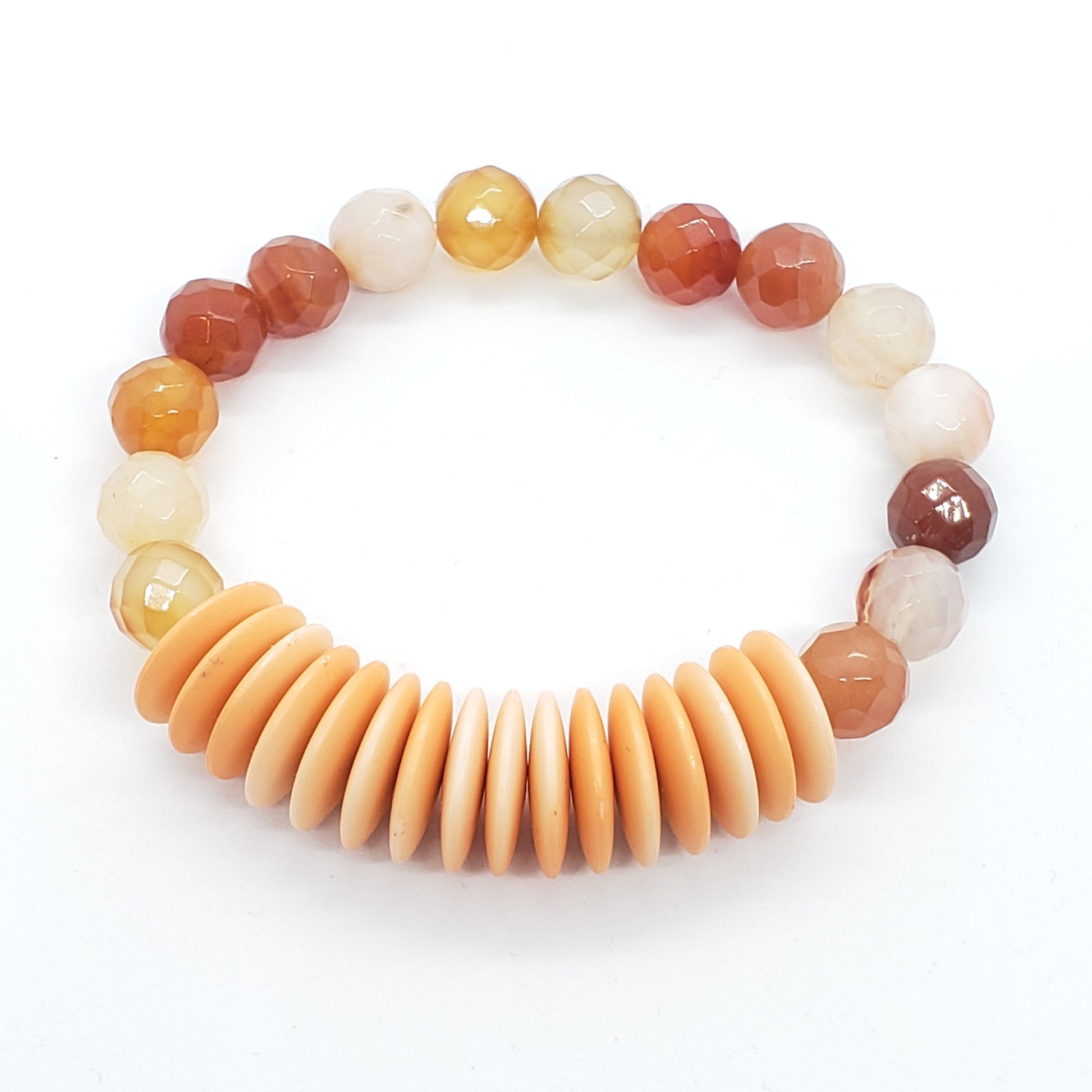 Faceted carnelian beaded elastic stretch bracelet with orange disc beads.