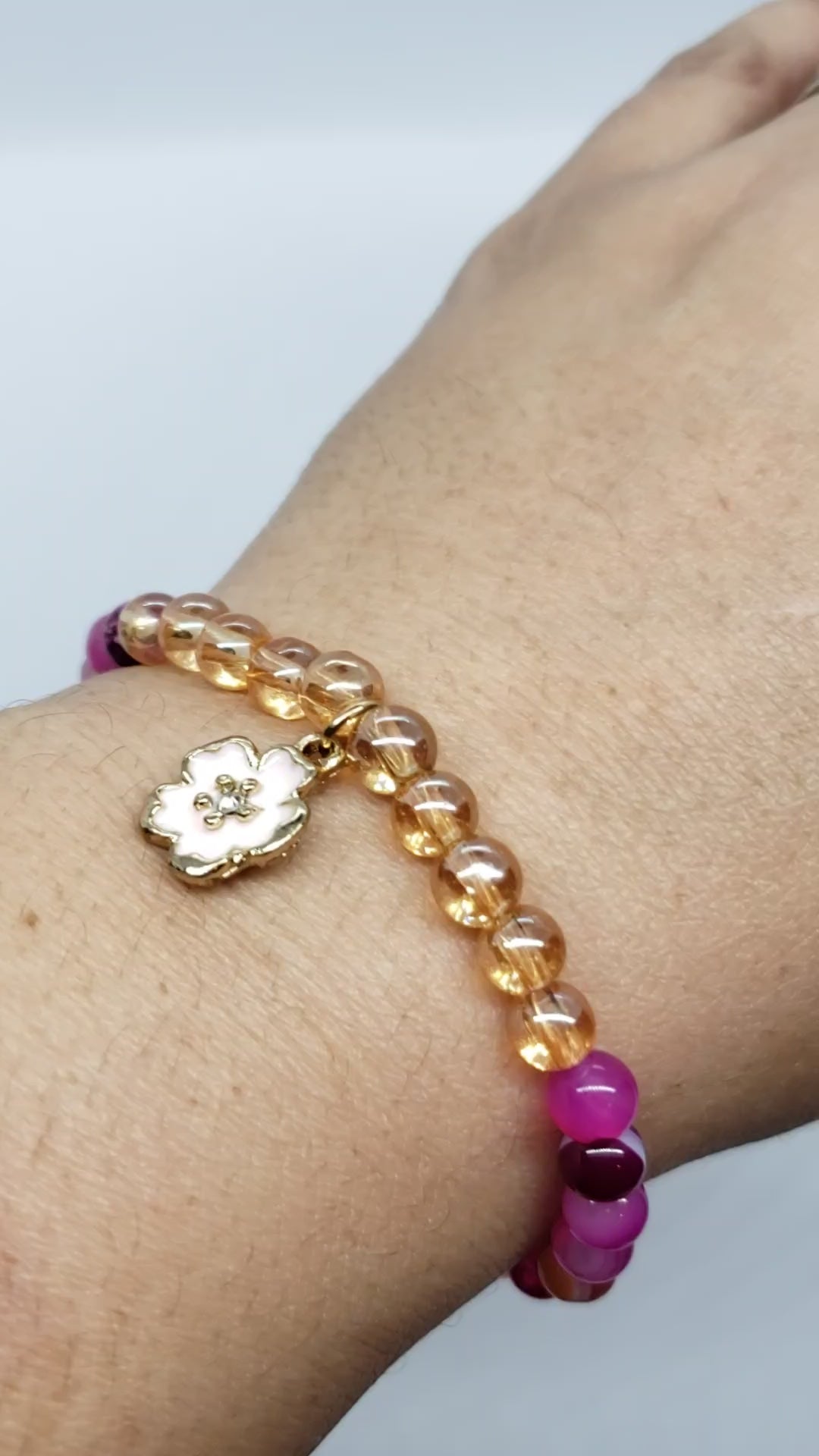Pink agate and glass beaded elastic stretch bracelet with pink flower charm.