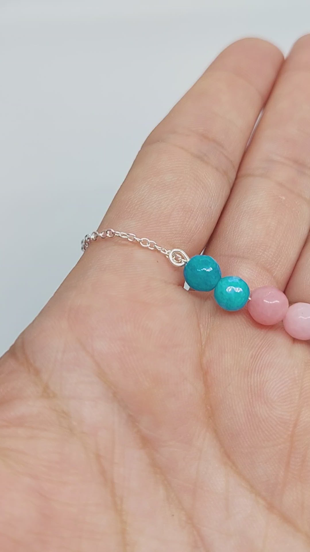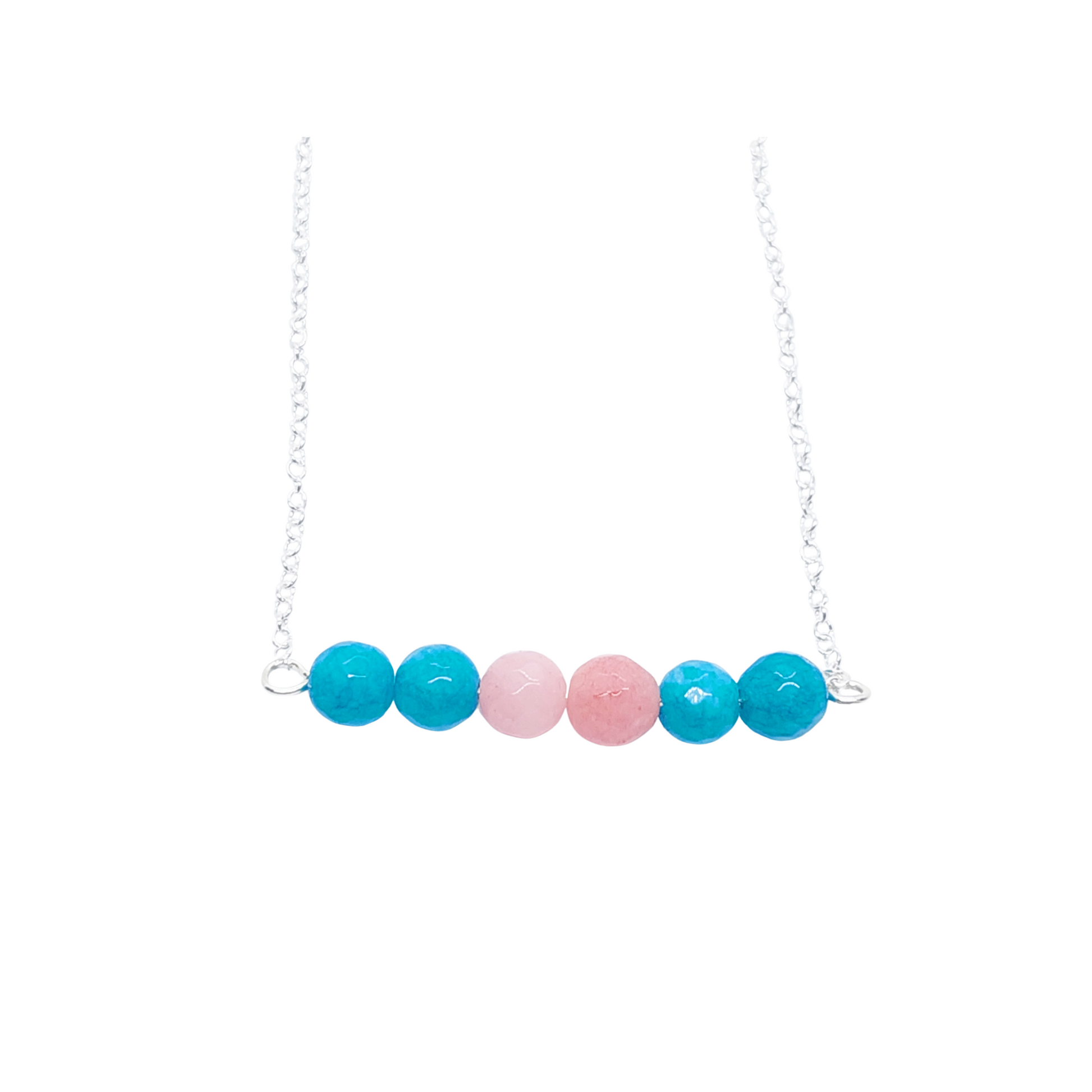 Blue and pink faceted beads bar necklace on an 18 inch stainless steel chain.