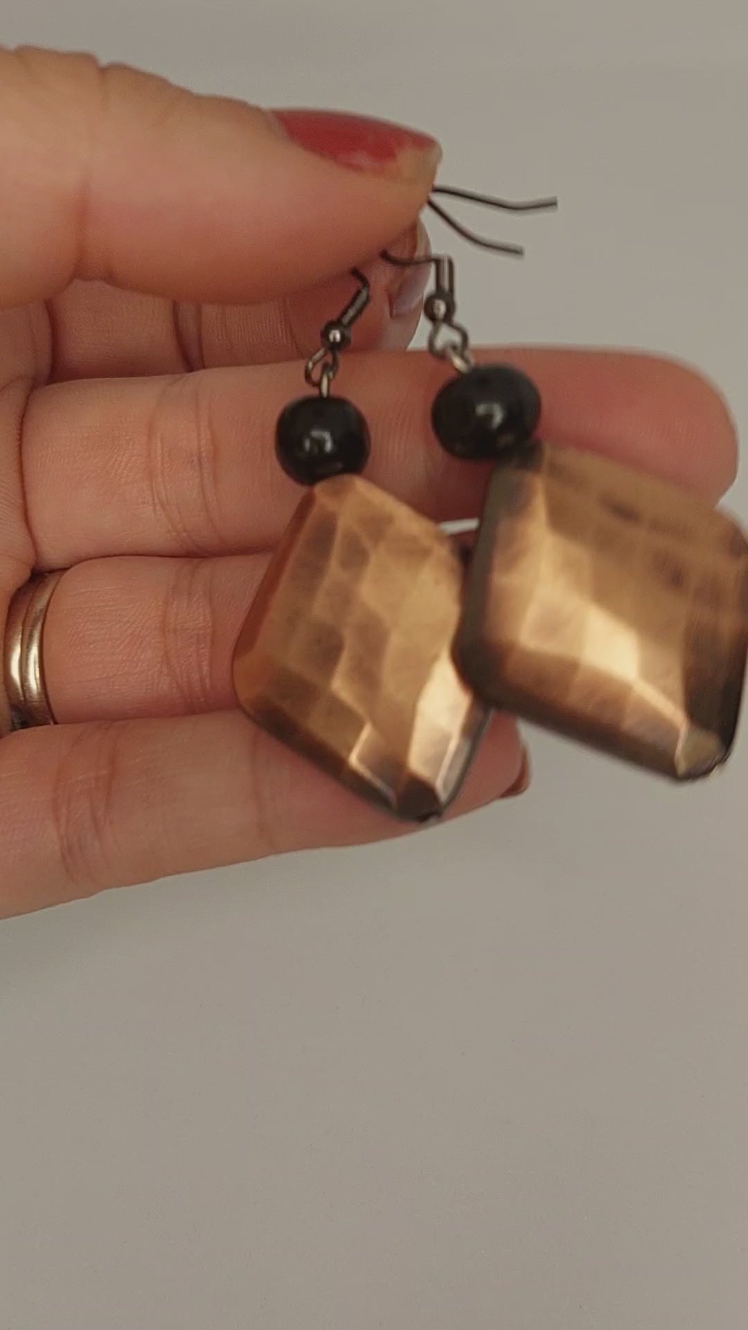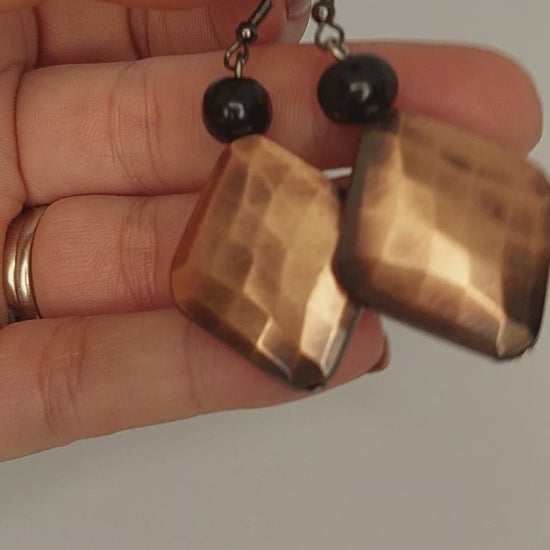 Copper diamond shaped beads with black wooden beads on stainless steel earring hooks.