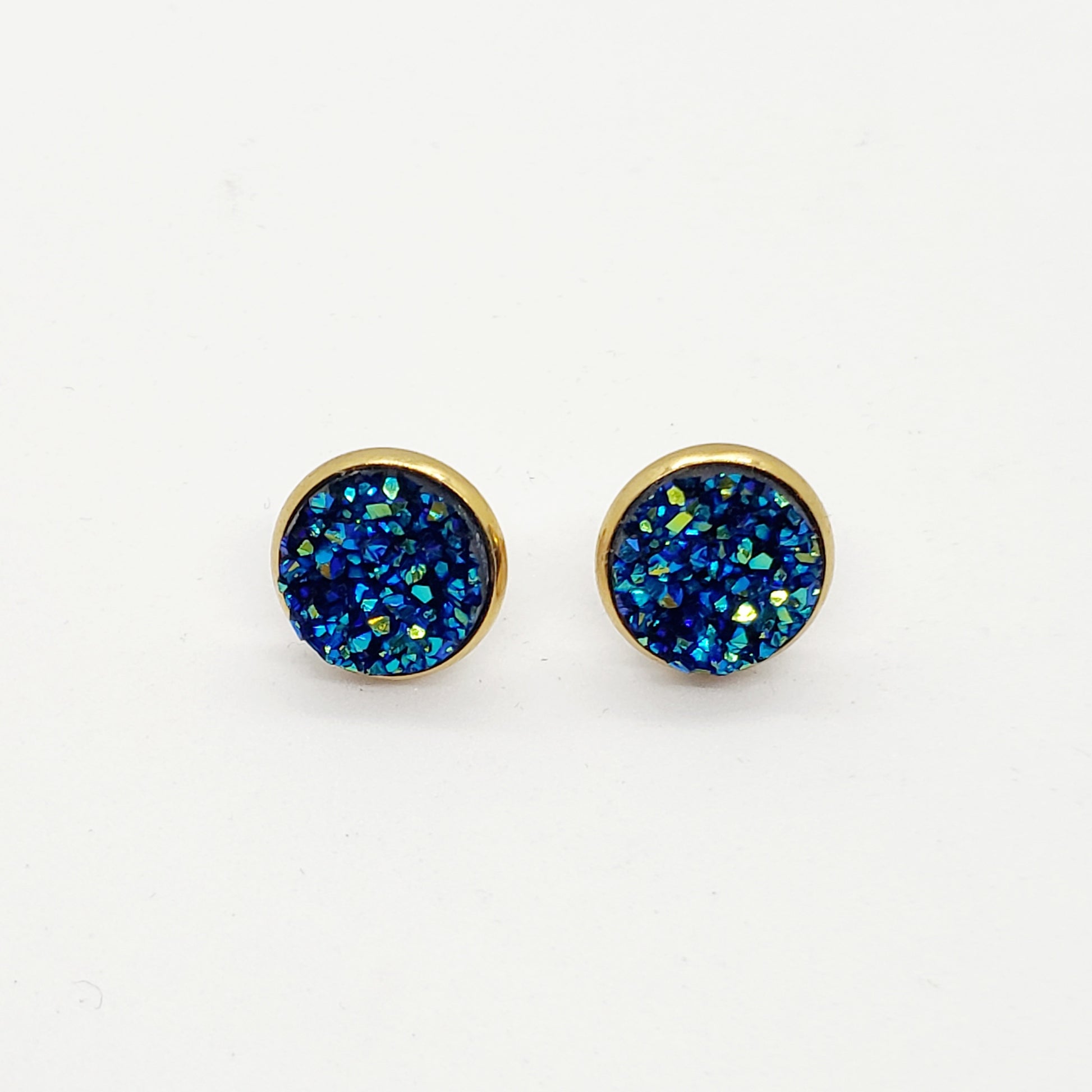 Gold plated stainless steel earring posts or hooks with blue druzy cabochon.