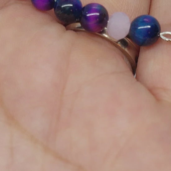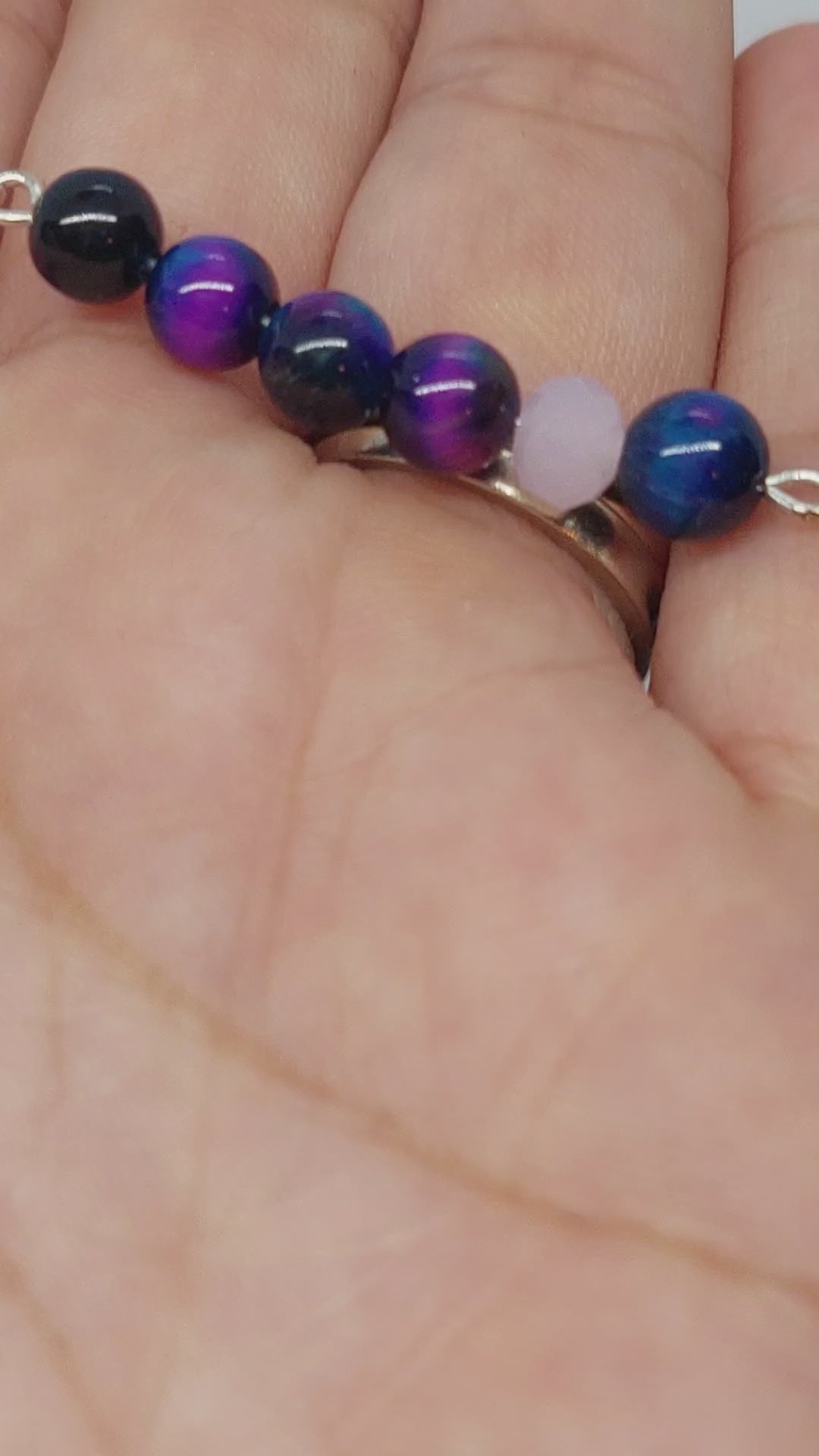 Galaxy tiger's eye and rose quartz beaded bar on silver plated 18 inch chain.