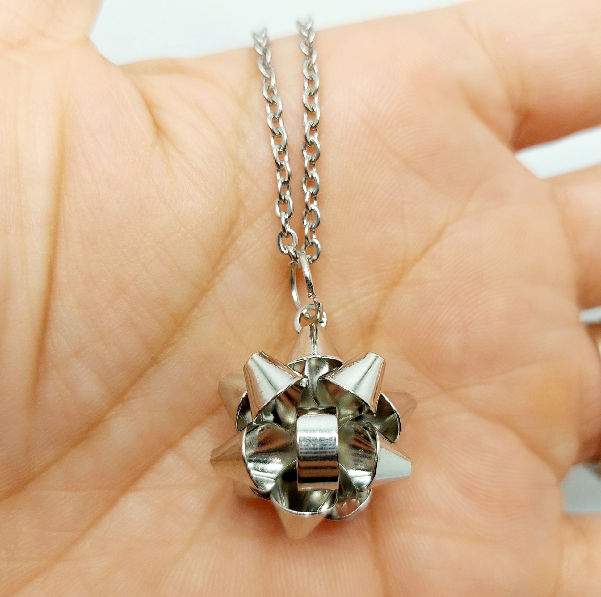 Metal gift bow charms on 18 inch stainless steel chain.