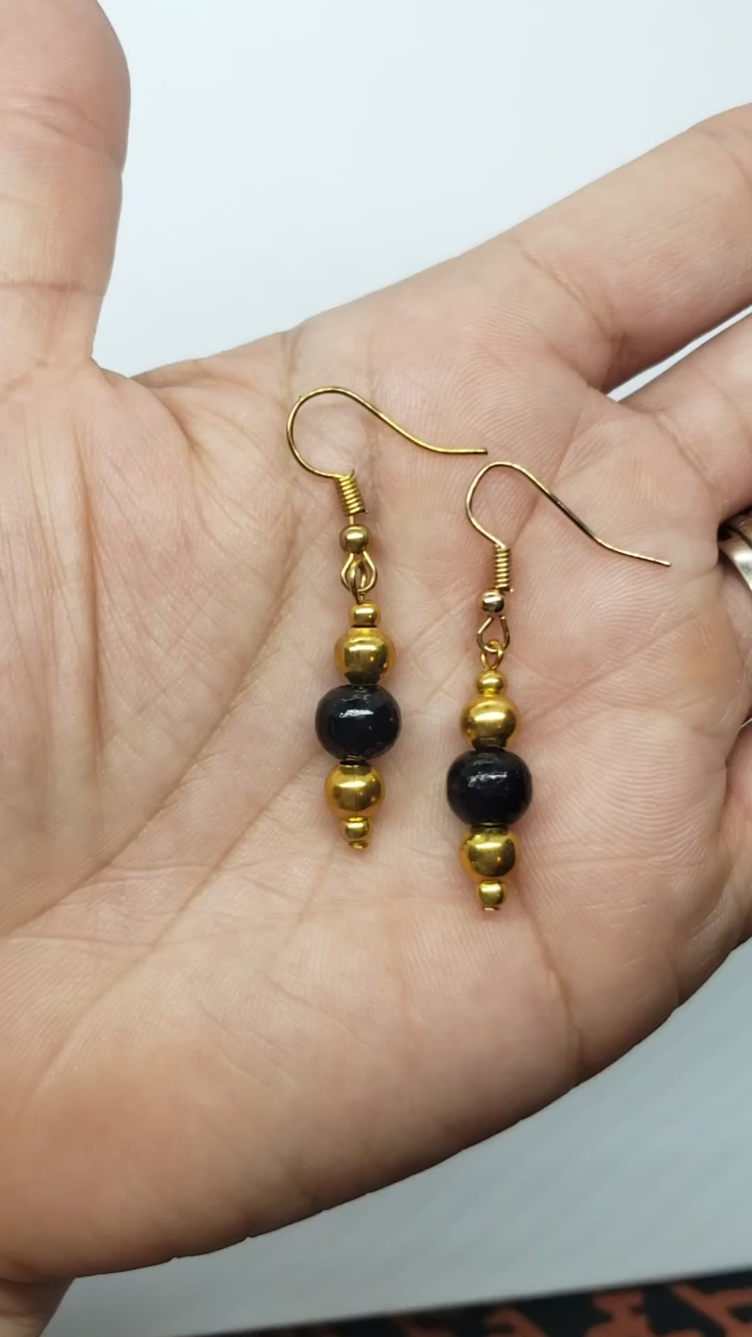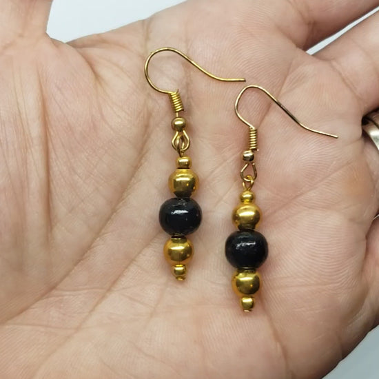 Golden beads and black wooden beads with stainless steelhypoallergenic earring hooks.