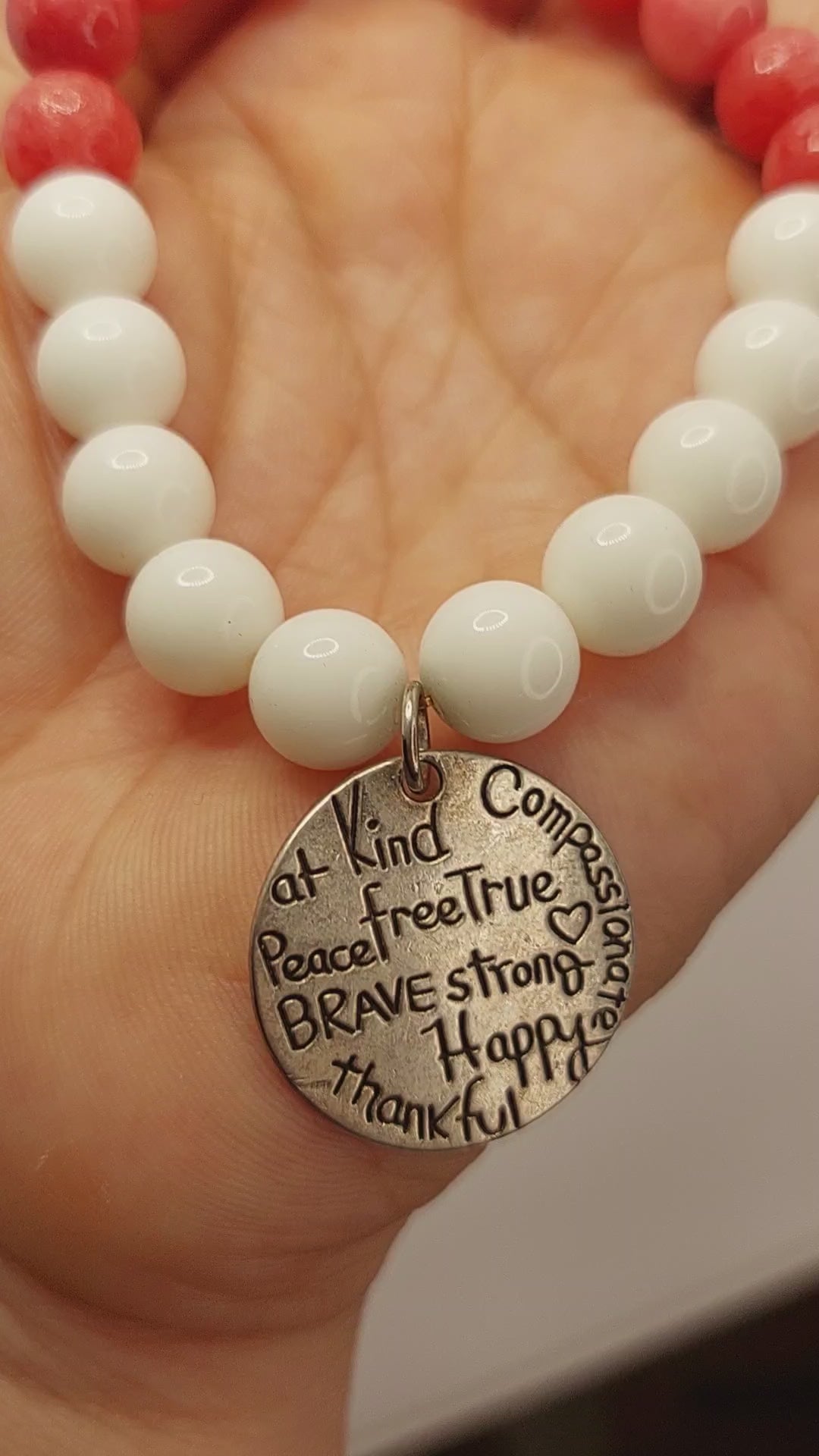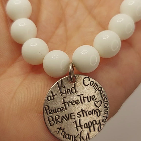 10mm pink beads and white alabaster elastic stretch bracelet with Be Kind, brave, happy etc. charm.