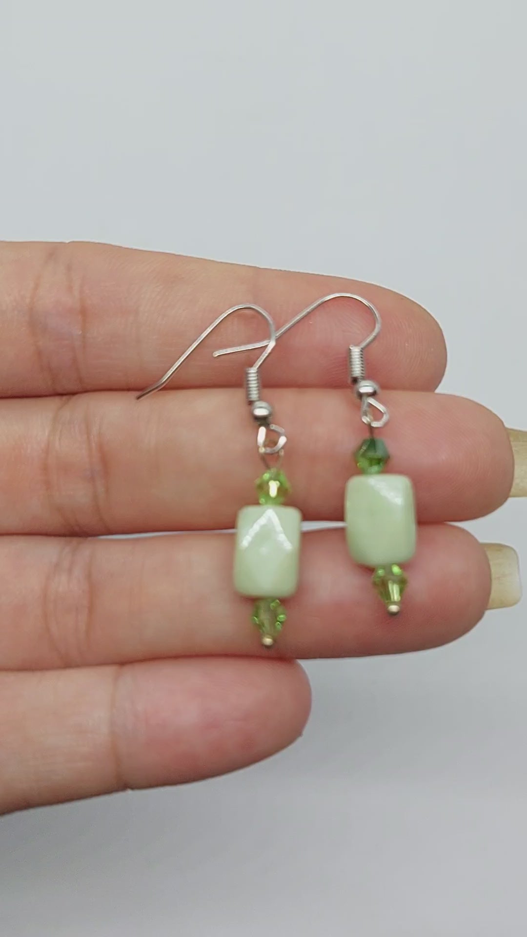 Green faceted glass and bicone beaded dangle earrings with stainless steel hypoallergenic earring hooks.