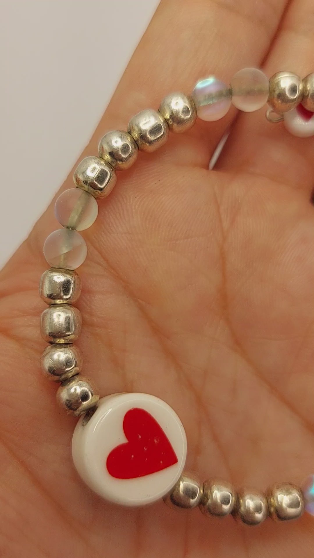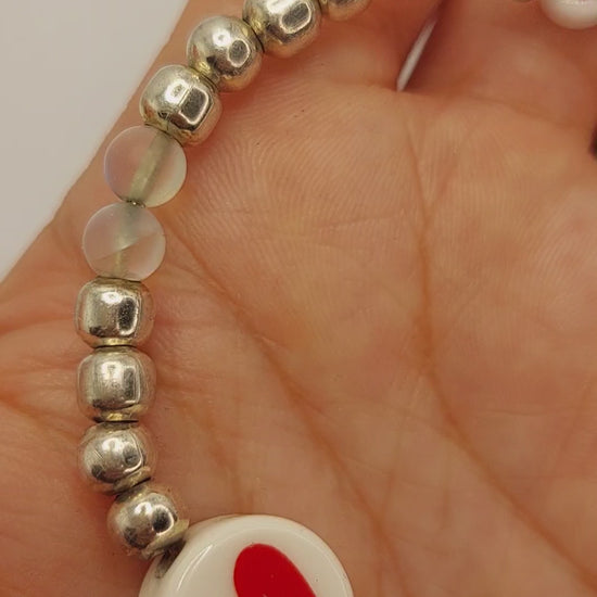 Silver plated and moonstone beaded wite wrap bracelet with red heart accent bead.