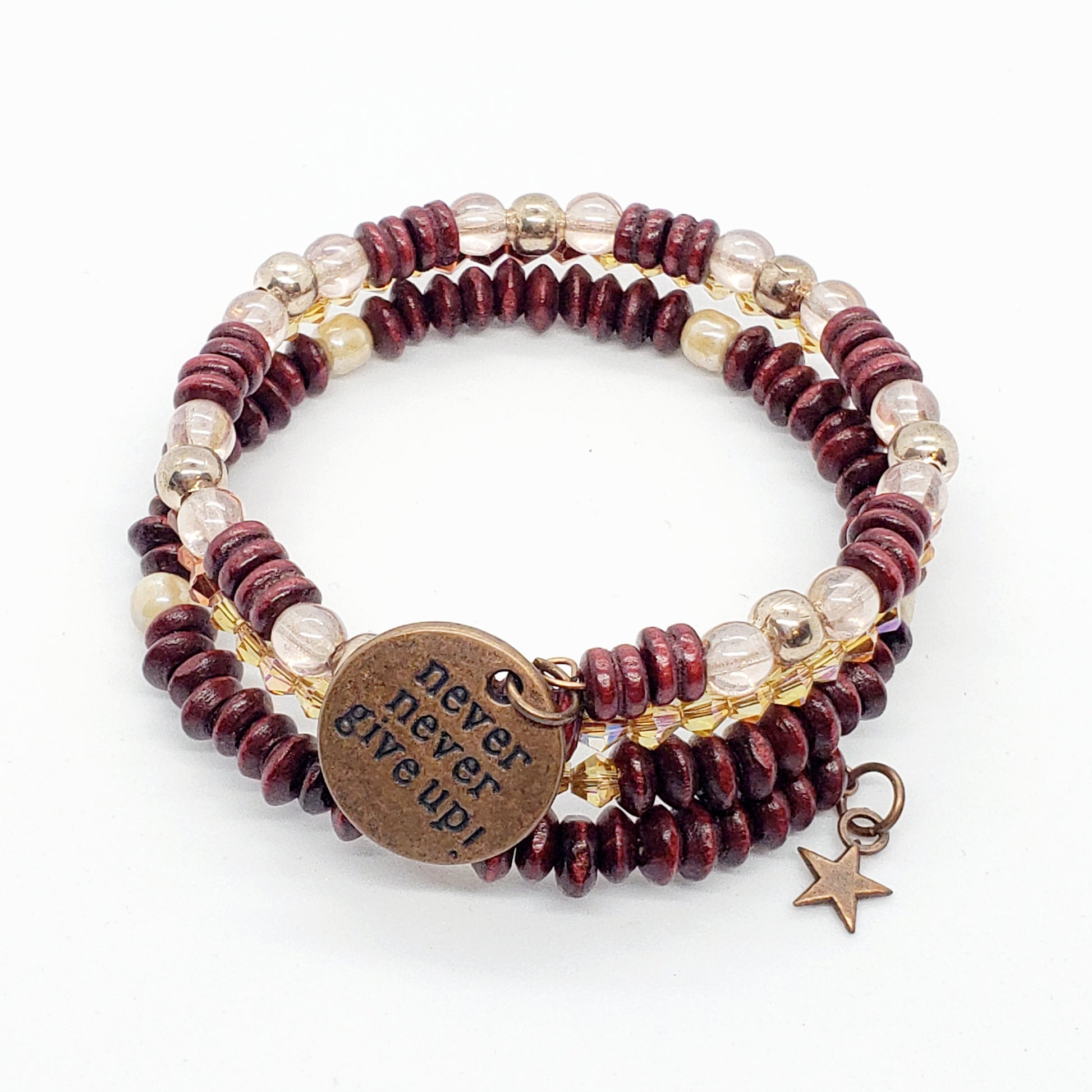 Burgundy wooden beads and glass beaded 3 tiered wire wrap around bracelet with never, never give up and star charms.