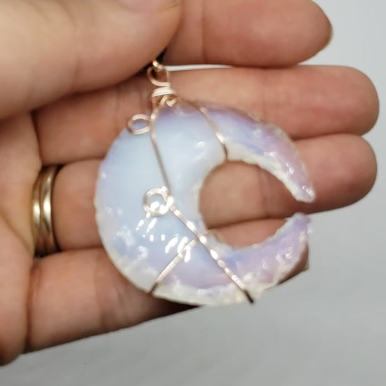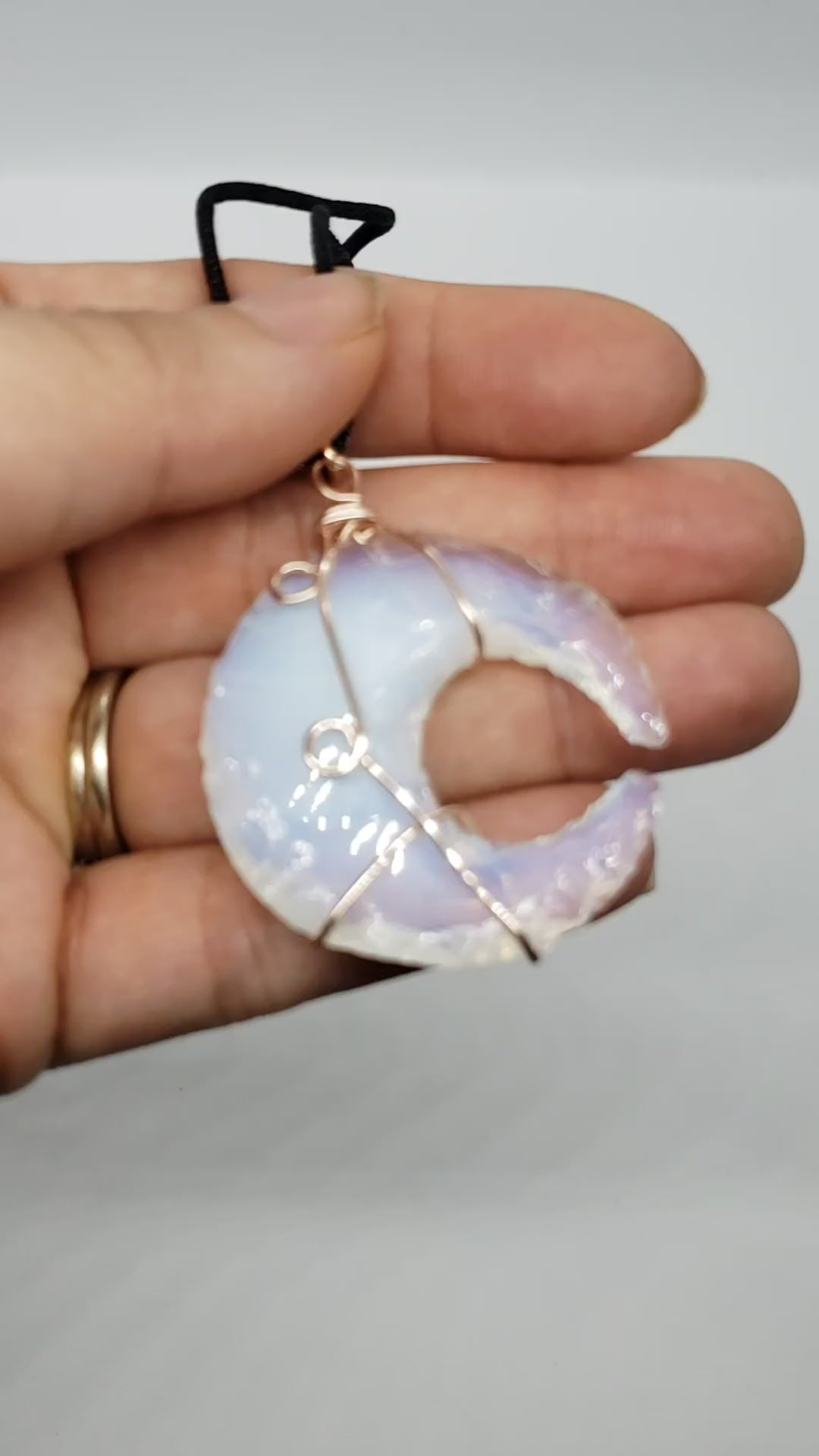 Opalite crescent moon wrapped in tarnish free rose gold wire on 18 inch adjustable faux leather cord.
