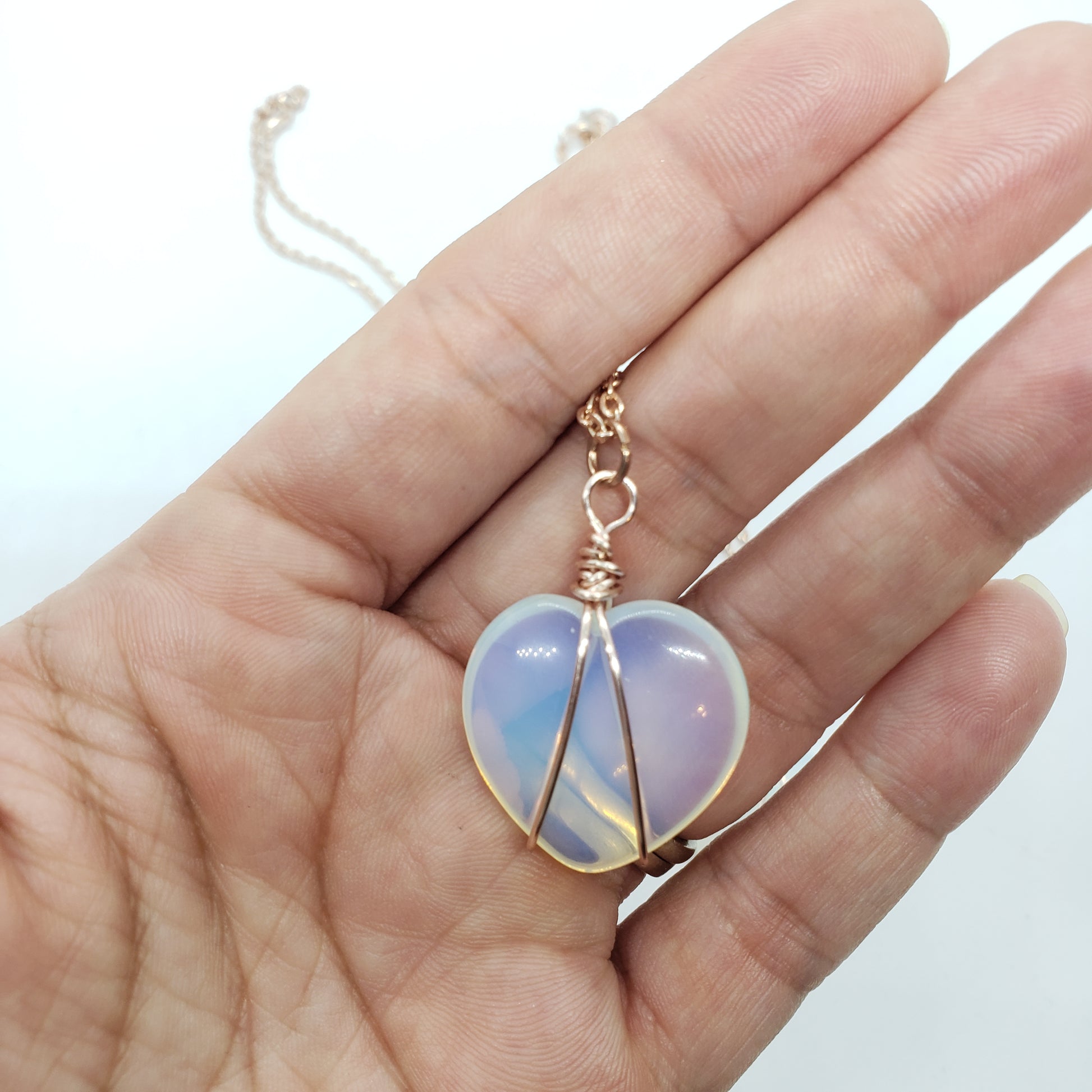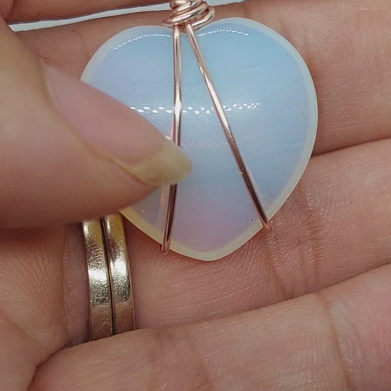 Wrapped opalite heart stone with rose gold plated 20 inch chain.