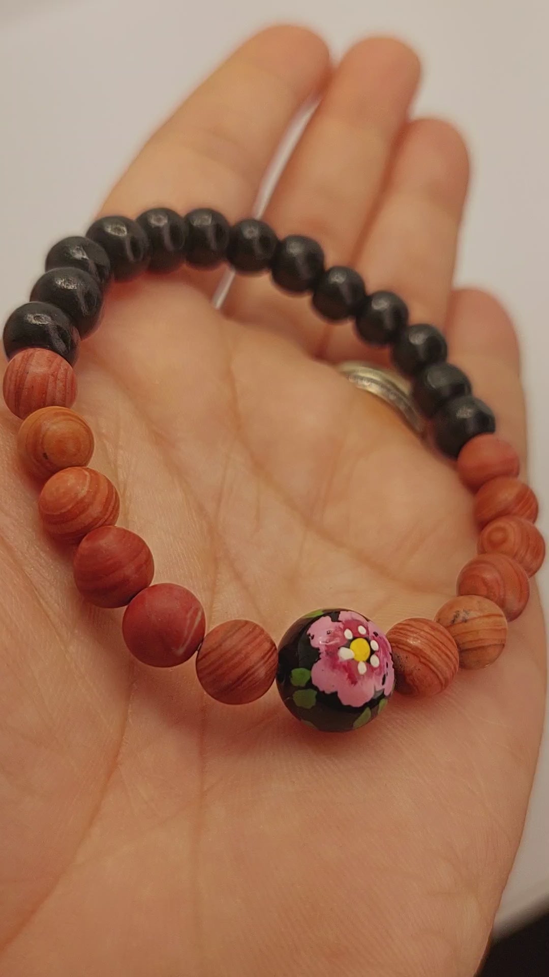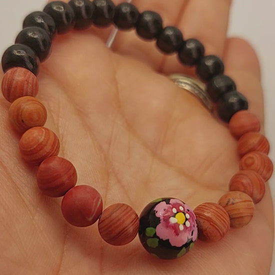 Red wood jasper and black wooden beaded elastic stretch bracelet with floral accent bead.