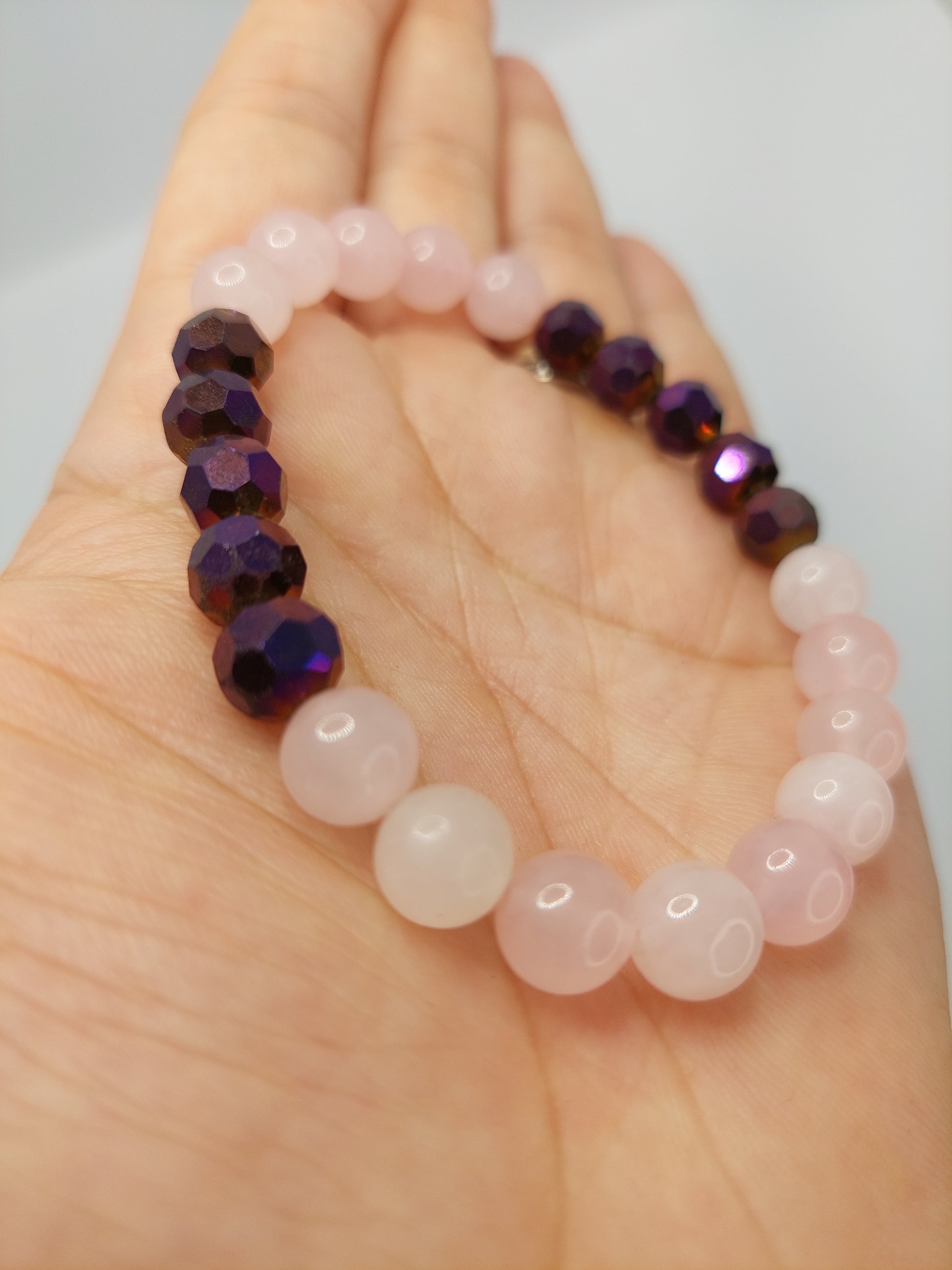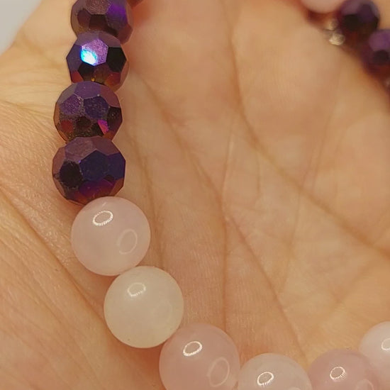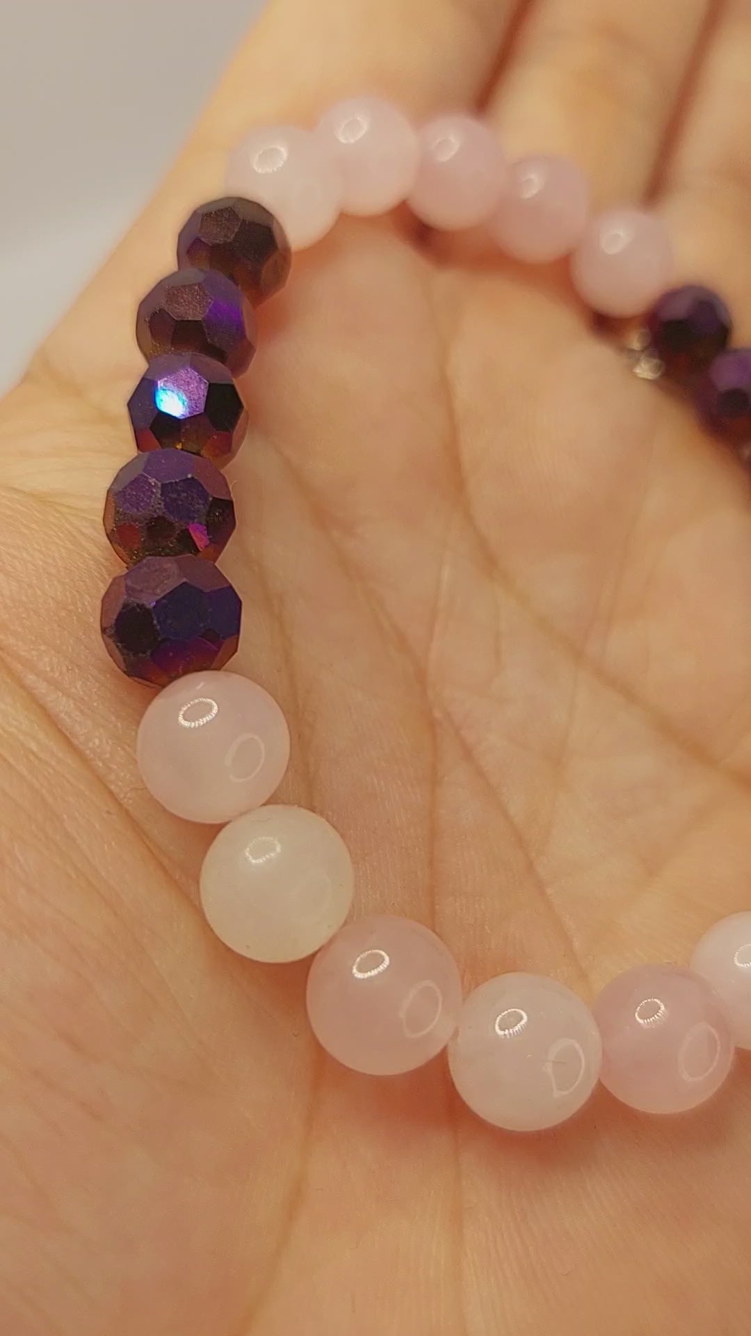 Rose quartz and purple iridescent beaded elastic stretch bracelet.