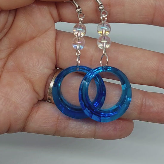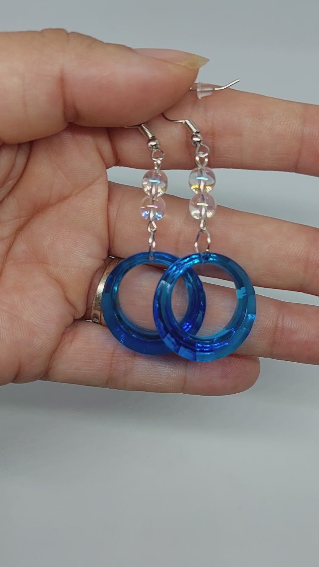 Blue plastic circle with angel aura beads on stainless steel earring hooks.