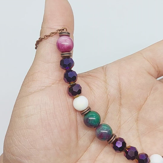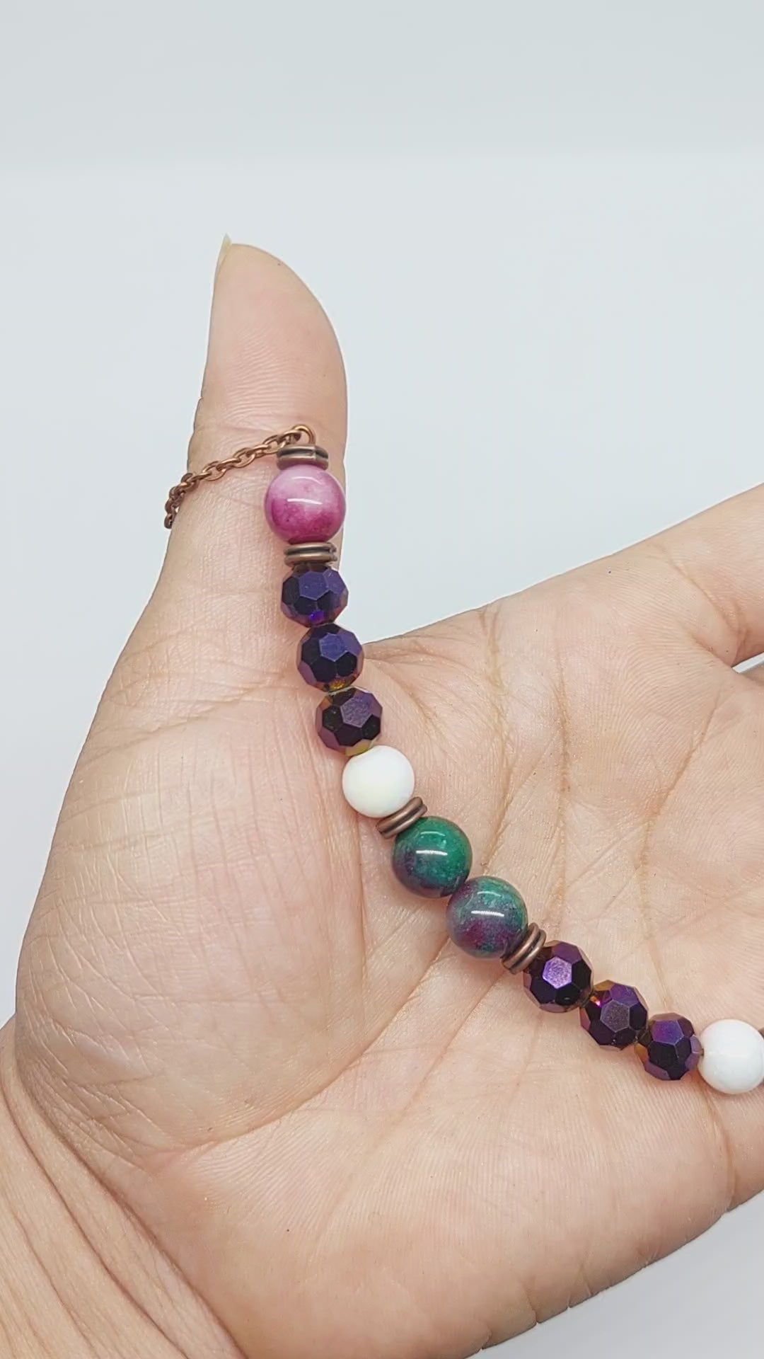 Multi color agate, white jade and purple crystal beaded bar on 18" antique copper chain.