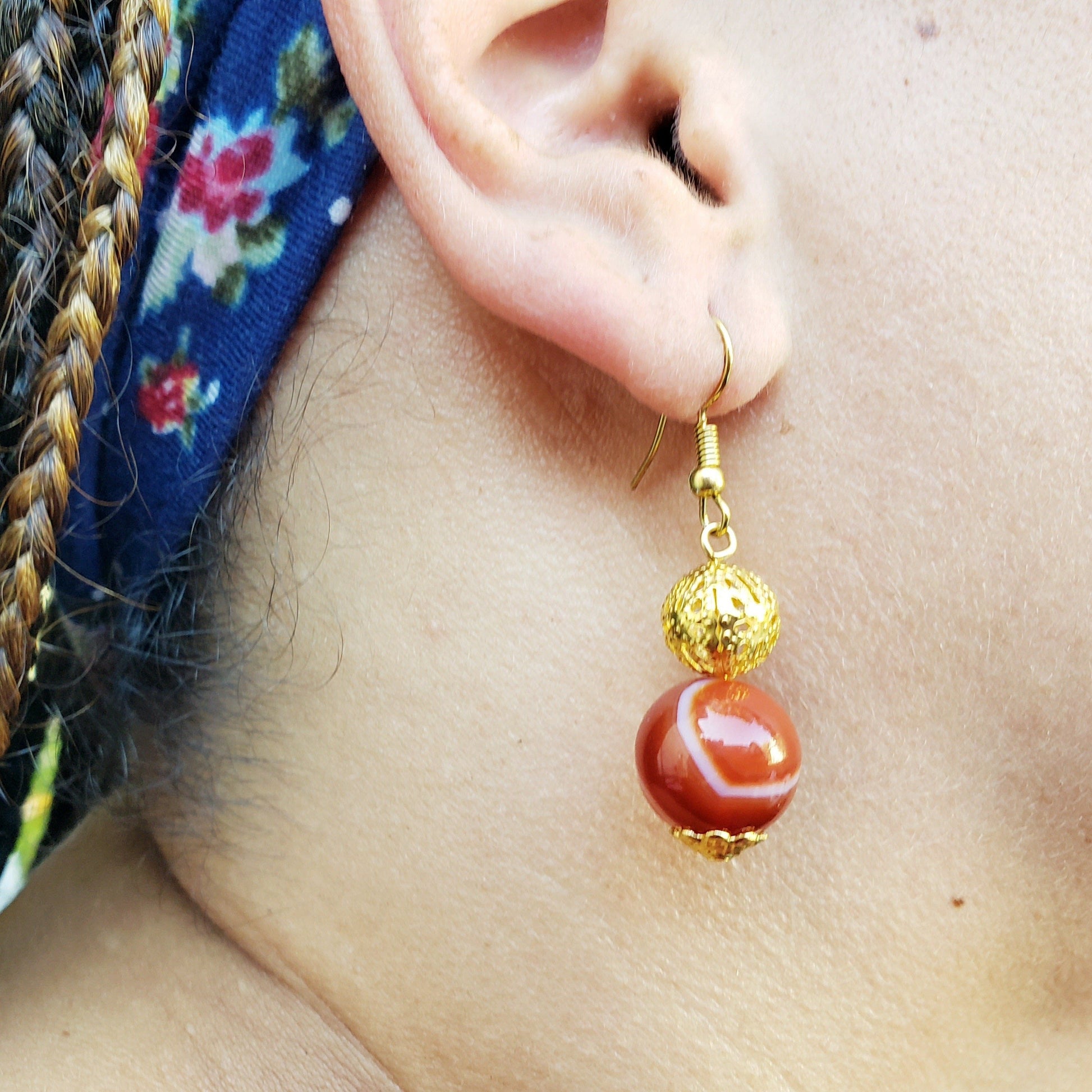 Red striped agate and gold beaded dangle earrings with gold plated stainless steel earring hooks.