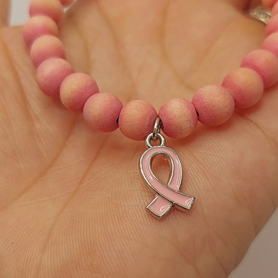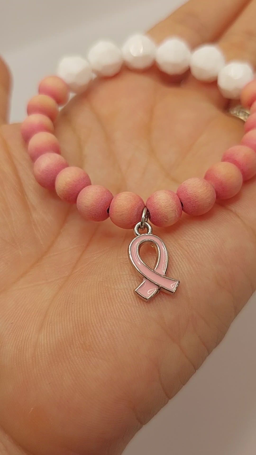 Pink wood and white plastic beaded elastic stretch bracelet with pink breast cancer ribbon.
