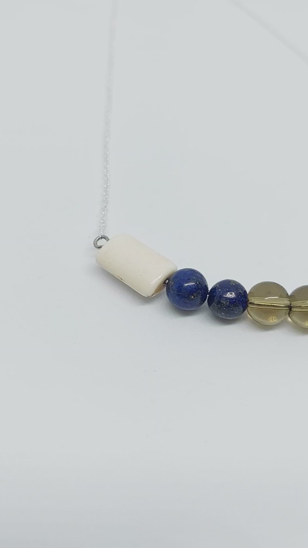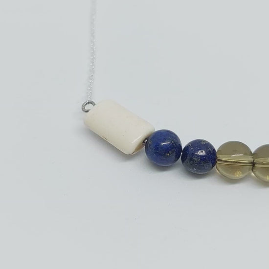 Smokey quartz, lapis lazuli and white turquoise beaded bar necklace on silver plated 18 inch chain.